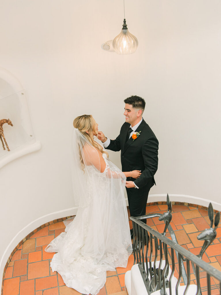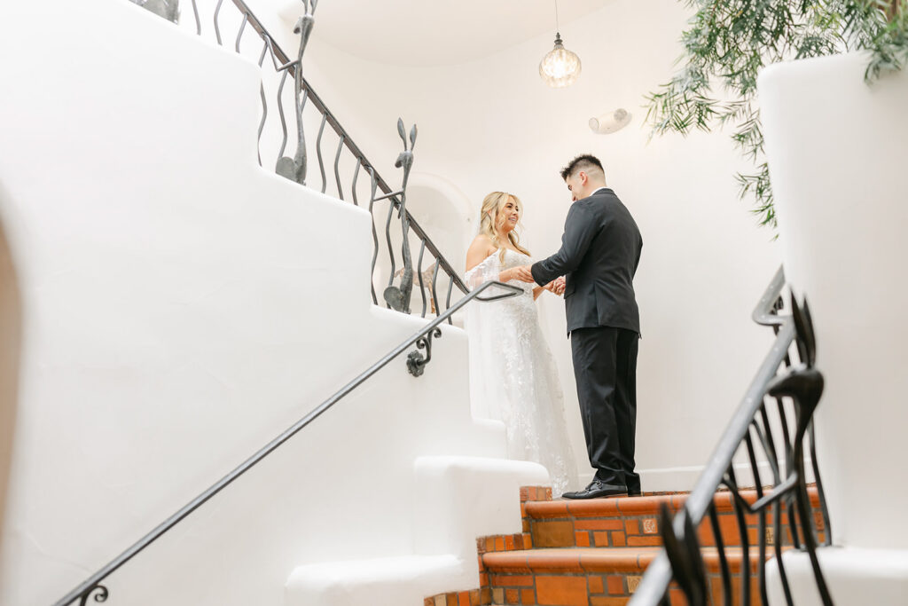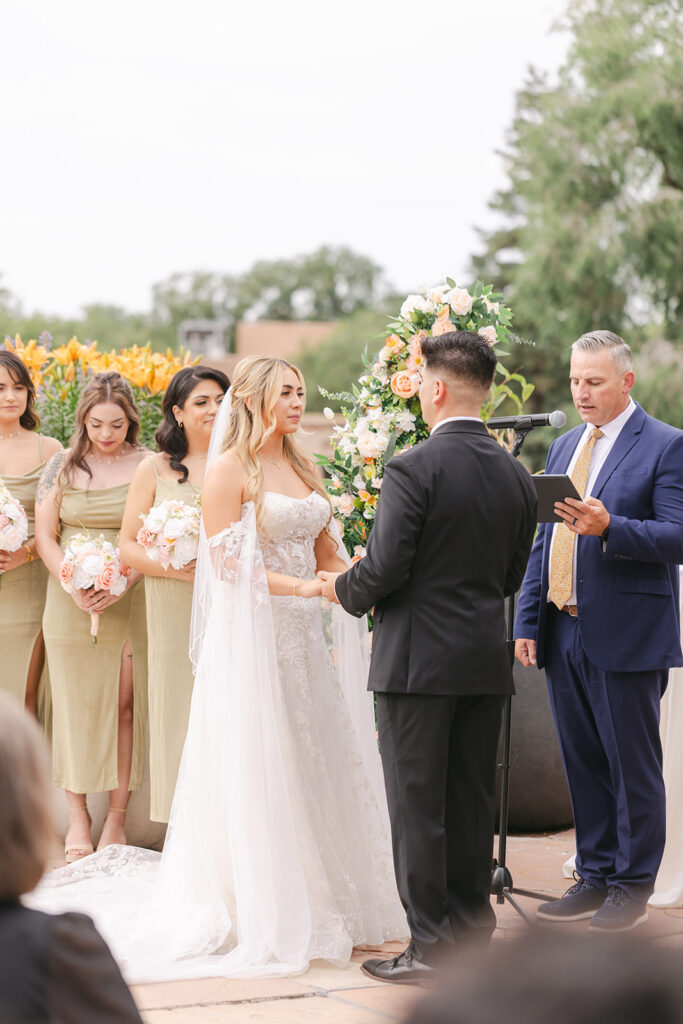 Before the ceremony, Regina and Kenneth shared a quiet, intimate first look on the staircase inside La Fonda one of my favorite hidden gems for wedding photos, with soft natural light and classic Southwestern architecture. Regina wore the most stunning gown with a flowing cape that added such a unique and elegant touch, especially as it moved during portraits. Every part of their wedding felt intentional, emotional, and deeply connected to both their story and the spirit of Santa Fe.